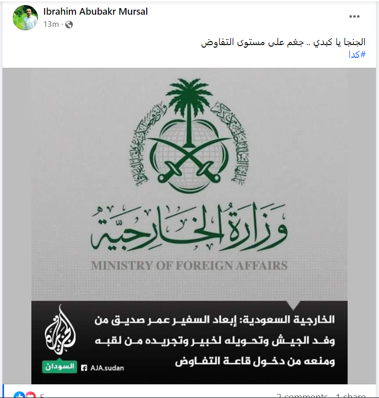 وأشار إلى أن ذلك يأتي تماشيًا مع إعلان جدة للالتزام بحماية المدنيين السودانيين الصادر في 11 مايو الماضي.