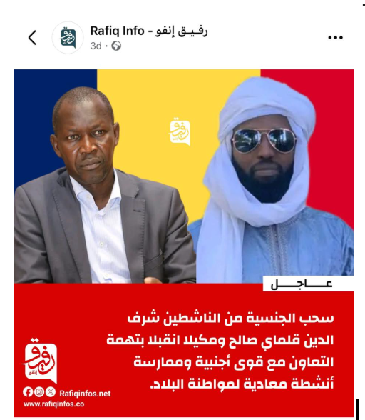 تداولت العديد من الحسابات على منصة «فيسبوك» ادعاءً يفيد بأن الرئيس التشادي محمد ادريس ديبي سحب  الجنسية التشادية من الناشطين شرف الدين قلماي صالح ومكيلا انقبلا بتاريخ 19 سبتمبر 2025.