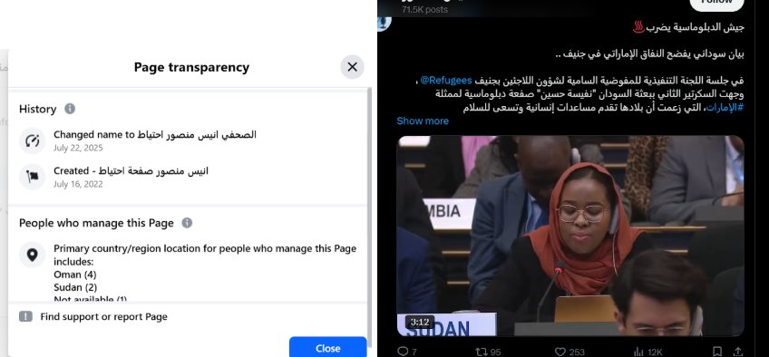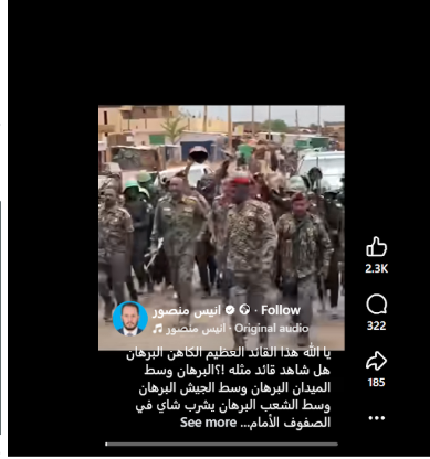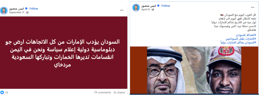 كما لاحظ فريق المرصد أنّ صفحة «السعادة» تنشر، بانتظام، محتوى حساب منصور، لضمان انتشاره وسط جمهورها البالغ عددهم 173 ألف متابع، إلى جانب حساب «الصحفي أنيس منصور احتياط (الصبيحي)» الذي يُعيد، إلى جانب إنتاجه محتوى يدعم توجهات حسابه الرسمي، نشر محتواه المتعلق بشأن السودان، على نحو منتظم.
