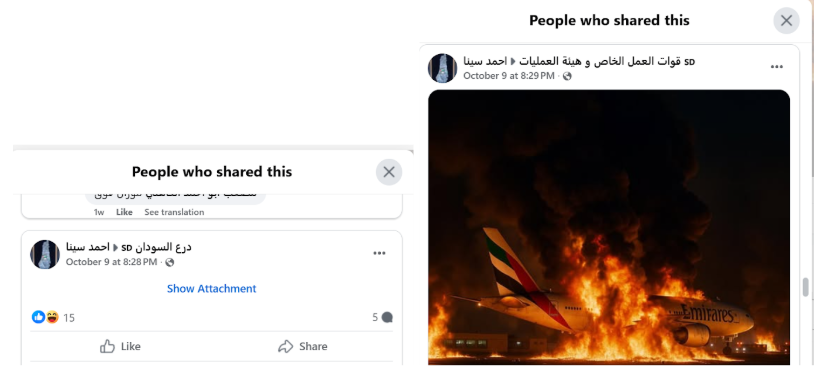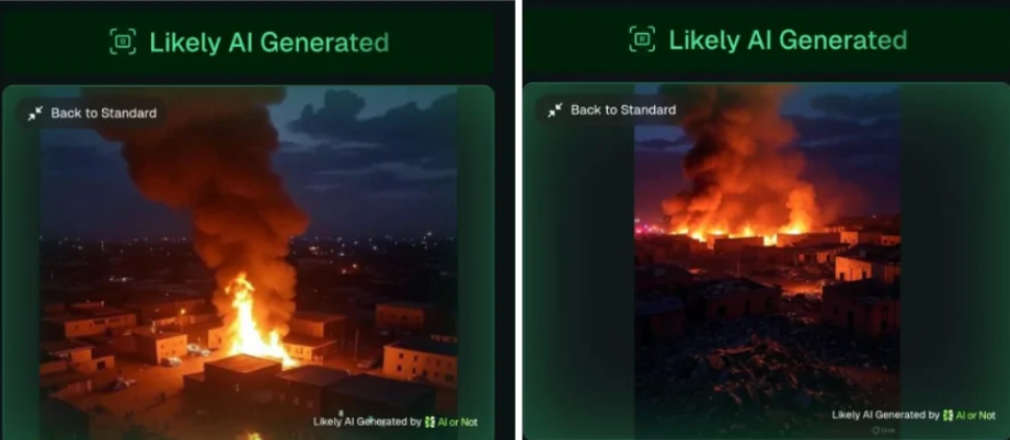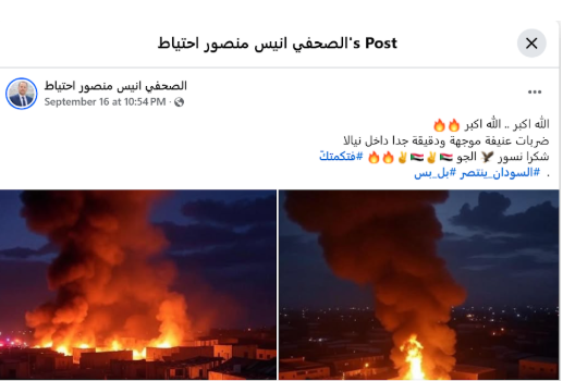 وعلى سبيل المثال، نشر حساب «الصحفي أنيس منصور احتياط (الصبيحي)» صورتين تُظهران حريقًا وحطامًا في منطقة يبدو أنها تعرضت للقصف، مدعيًا أنهما توثقان «ضربات عنيفة وموجّهة ودقيقة جدًا» شنّها الجيش السوداني على مدينة نيالا عاصمة ولاية جنوب دارفور غربي السودان، ومقر الحكومة التي أعلن عنها تحالف «تأسيس» بقيادة «الدعم السريع». وبعد أن فحص «مرصد بيم» الصورتين المتداولتين مع الادعاء، تبيّن أنهما مولّدتان بالذكاء الاصطناعي، ومع ذلك لقي الادعاء تفاعلًا عاليًا من المتلقين.