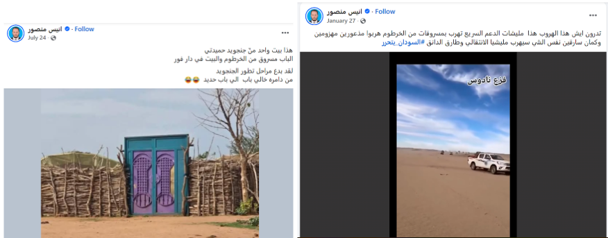 ولدعم توجهاته المناوئة لـ«الدعم السريع»، نشر الحساب الرسمي لأنيس منصور على «فيسبوك» مقطع فيديو، في يوم 27 يناير 2025، زاعمًا أنه يوثق هروب عناصر «الدعم السريع» من الخرطوم، مهزومين وبحوزتهم أغراض مسروقة من المواطنين. وبالبحث العكسي عن مقطع الفيديو في ذلك الوقت، توصّل فريق المرصد إلى أنه قديم، نُشر في منتصف يناير، من دون توضيح للسياق أو ما يؤكد ارتباطه بهروب عناصر «الدعم السريع» من الخرطوم.