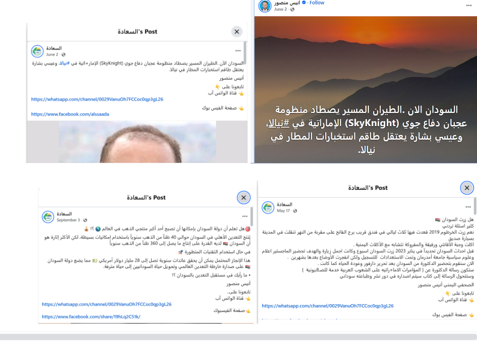 إلى جانب حساباته الشخصية على «فيسبوك»، لاحظ «مرصد بيم» أيضًا أنّ حسابات ومجموعات أخرى تنُشر المحتوى الذي يقدمه أنيس منصور، على نحو منسق مع الحساب الرسمي. فعندما نشر حسابه في الساعة الواحدة بعد منتصف ليل الثاني من يوليو الماضي، مزاعم عن تدمير منظومة دفاع جوي إماراتية في نيالا (جنوب دارفور) بطائرة مسيّرة تابعة للجيش السوداني، لحِقته صفحة على «فيسبوك» باسم «السعادة» ونشرت المحتوى نفسه في الساعة السادسة صباحًا ونسبته إلى أنيس منصور.