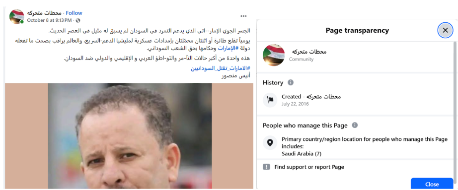 ولاحظ فريق المرصد كذلك نشاط صفحة أخرى باسم «محطات متحركة»، يتابعها نحو 200 ألف متابع، أُنشئت أيضًا في يوليو 2022، وتُدار من العاصمة السعودية الرياض. وتنشر الصفحة محتوى عن التطورات في السودان، إلى جانب تطورات الأوضاع في الشرق الأوسط. ومن الملاحظ نشاطها في نشر محتوى داعم للجيش السوداني عمومًا. وظهر ارتباطها بأنيس منصور، جليًا، عند نشرها محتوى حسابه، خاصةً المنشورات المناوئة لدولة الإمارات. وتعتمد الوسوم التي يستخدمها الحساب بانتظام، مثل وسم «#الامارات_تقتل_السودانيين».