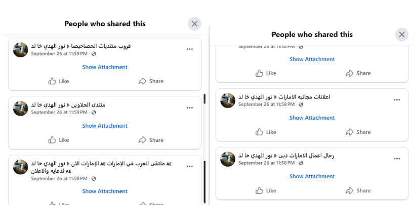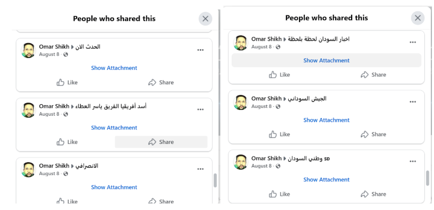 وعلى سبيل المثال، حين نشر حساب أنيس منصور منشورًا عن تورط الإمارات في تمويل حملة علاقات عامة بهدف تلميع نفسها وطمس أدوارها في قتل السودانيين وحصارهم وتشريدهم، شارك حساب «Omar Shikh» المنشور في عدد كبير من المجموعات العامة على «فيسبوك». وفي منشور آخر عن القائد العام للجيش السوداني نشره حساب أنيس منصور، لاحظ فريق المرصد أن حسابًا باسم «نور الهدى خالد» أعاد نشر المحتوى في «مجموعات» كبيرة على «فيسبوك». والقاسم المشترك بين هذه الحسابات هو أنها مغلقة وتعيد نشر محتوى أنيس منصور ومحتوى مشابه له في مجموعات على «فيسبوك».