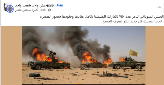 تداولت العديد من الحسابات على منصة «فيسبوك» صورة تُظهر عربات محترقة في منطقة صحراوية، مدعيةً أنّها توثق تدمير الجيش السوداني 750 عربة قتالية تابعة لـ«الدعم السريع» مع عناصرها، في محور الصحراء.