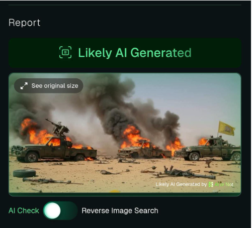 للتحقق من صحة الادعاء، فحَص «مرصد بيم» الصورةَ المتداولة مع الادعاء، بأدوات التحقق من الصور، وتوصّل إلى أنها مولَّدة بأدوات الذكاء الاصطناعي.