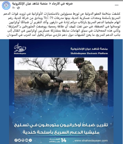 تناقلت حسابات على منصة «فيسبوك» ادعاءً يفيد بصدور تقرير عن منظمة العفو الدولية بخصوص تورط مسؤولين بالاستخبارات الأوكرانية في إمداد قوات الدعم السريع بأسلحة ومعدات عسكرية كندية، في حين نفت كييف أيّ صلة رسمية لها بالأمر، ووصفت المتورطين بـ«المرتزقة» – بحسب نص الادعاء.