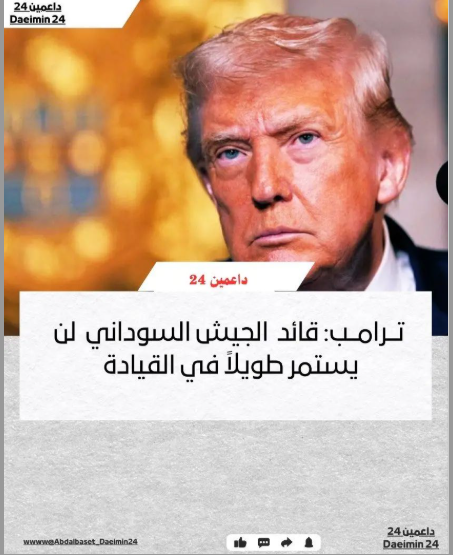 تداولت حسابات على منصة «فيسبوك» تصريحًا منسوبًا إلى رئيس الولايات المتحدة الأمريكية دونالد ترامب، جاء فيه أن «قائد الجيش السوداني لن يستمر طويلًا في القيادة».