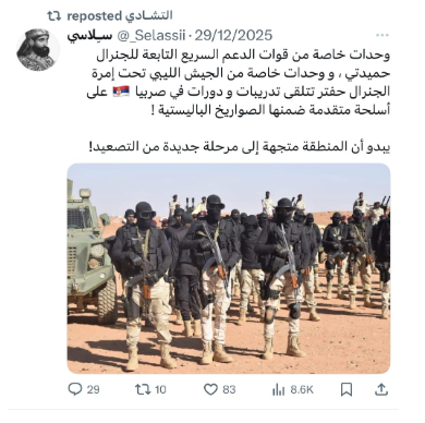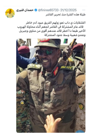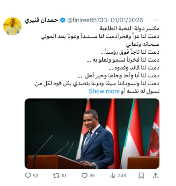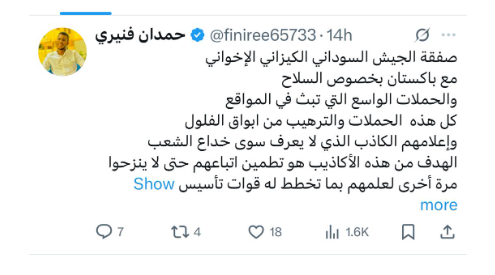 ومن حسابات الشبكة أيضًا حساب باسم «حمدان أفنيري»، أنشئ في مارس 2024، ويتابع حساب «منير الأمين»، وينشر محتوى يدعم قوات الدعم السريع ويعادي القوات المسلحة السودانية والحركات المشتركة.