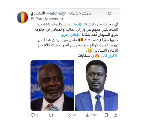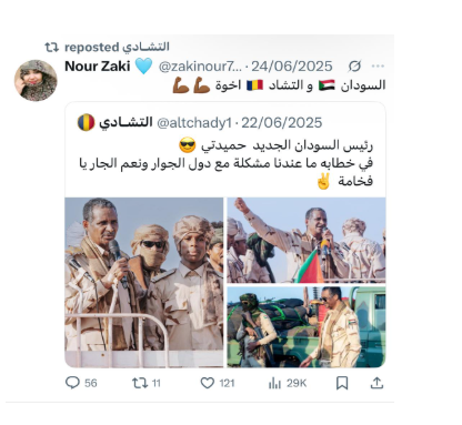 تنشط معظم الحسابات التشادية الناطقة بالعربية والتي تدافع عن دولة تشاد وسياسات الحكومة وتهاجم الجيش السوداني، وتتبنى سردية قوات الدعم السريع، في عمل منسق، يتضمن التضليل بغرض تحقيق أهدافها في تضخيم المحتوى لمصلحة الرئيس التشادي، والإساءة إلى قادة الجيش السوداني، مع مدح قوات الدعم السريع وتأييد مواقفها.