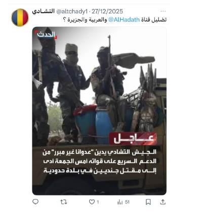 ويتبنى حساب «منير الأمين» السردية نفسها، إذ نشر مزاعم بأن القوات المسلحة السودانية استهدفت معسكرًا للجيش التشادي في «الطينة» التشادية، مما أدى إلى مقتل جنديين تشاديين وإصابة آخر. في وقت لم تشِر فيه هيئة الأركان العامة للجيش التشادي إلى القوات المسلحة السودانية، في بيانها الرسمي بشأن الحادثة، وقالت إن المسيرة أتت من الأراضي السودانية دون تحديد الجهة التي أطلقتها.