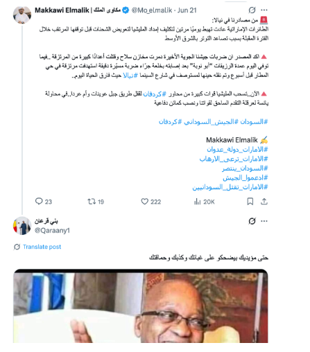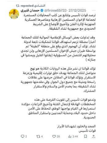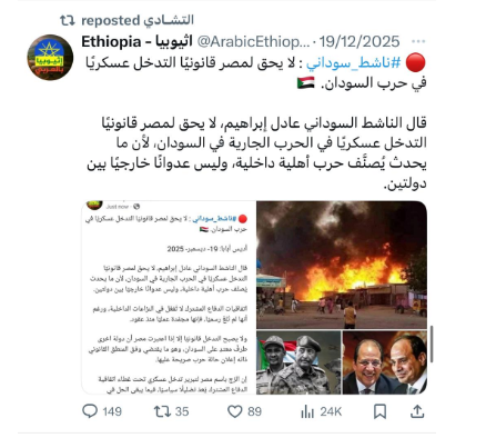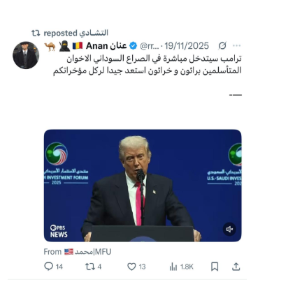 وأعاد حساب «اثيوبيا Ethiopia» نشر محتوى من حساب باسم «عنان» توعد فيه من أسماهم «الأخوان المسلمين»، في إشارة إلى الجيش السوداني وحلفائه، بتدخّل مباشر من الرئيس الأمريكي دونالد ترامب في الصراع السوداني.