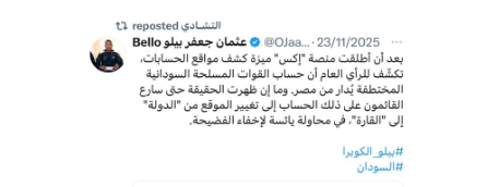 كذلك يروج حساب «عثمان جعفر بيلو» أنشئ في نوفمبر 2025 باسم المستخدم @OJaafarBello لسردية معادية للجيش السوداني، وينشر مزاعم بشأن تدخل مصر في الشأن السوداني.