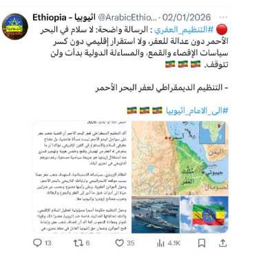 ويتبنى حساب «اثيوبيا Ethiopia» الذي أنشئ في أبريل 2021 باسم المستخدم @ArabicEthiopia السردية نفسها المعادية للقوات المسلحة السودانية. حيث أعاد الحساب نشر محتوى ناشط سوداني يُدعى عادل ابراهيم يقول فيه إنه لا يحق لمصر التدخل في الشأن السوداني. كما نشر صورًا للبحر الأحمر، قائلًا إنه لن يكون هناك سلام في البحر الأحمر دون عدالة «العفر»، في إشارة إلى التنظيم الديمقراطي لعفر البحر الأحمر، وهو تيار مسلح من قومية العفر في القرن الإفريقي (إثيوبيا وإريتريا) يطالب بالعدالة لشعبه وتحسين أوضاعهم المعيشية وفتح منفذ بحري لاثيوبيا.