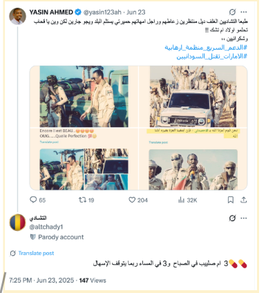 - تنشر الحسابات محتوى بالأسلوب نفسه وتدعم الخطاب نفسه المعادي للسودان مع محاولات لتشويه سمعة الجيش السوداني ودعم قوات الدعم السريع.