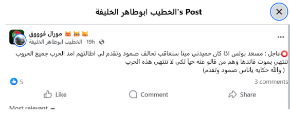 تداولت حسابات على «فيسبوك» تصريحًا منسوبًا إلى كبير مستشاري الرئيس الأمريكي للشؤون العربية والإفريقية مسعد بولس، يتوعّد فيه تحالفي «صمود» و«تقدّم» بالمحاسبة في حال ثبت أنّ قائد قوات الدعم السريع «حميدتي» متوفى، وذلك بسبب ما أسماه الادعاء «إطالة أمد الحرب»، مشيرًا إلى أنّ «جميع الحروب تنتهي بموت قائدها»، وأنّ التحالفين زعما أنّ «حميدتي ما يزال حيًا» – بحسب نص الادعاء.