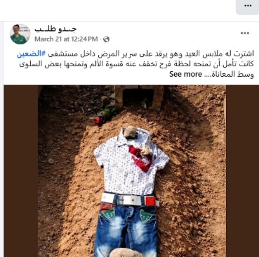 تداولت حسابات على منصة «فيسبوك» صورة ثوبٍ على قبر طفل، مدعيةً أنها توثق ثوبًا اشترته أم لطفلها المريض ليرتديه في العيد، ثم وضعته على قبره، بعد أن قُتل جراء القصف الذي استهدف مستشفى الضعين بولاية شرق دارفور في 20 مارس الجاري.
