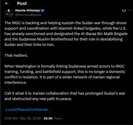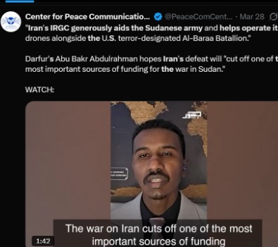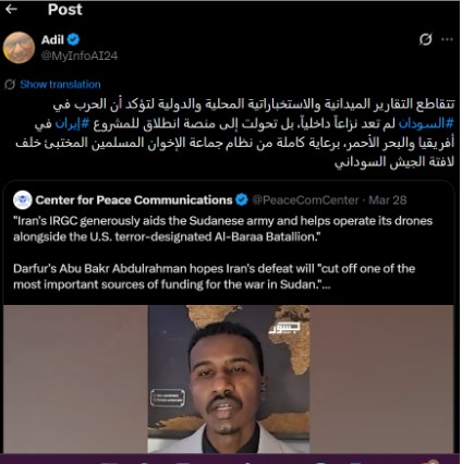 لاحظ فريق المرصد نشاط عديد من الحسابات على منصة «إكس»، عقب الهجوم الأمريكي الإسرائيلي على إيران، إذ نشرت حسابات إماراتية داعمة لـ«الدعم السريع»، منها حساب Rauda Altenaiji الذي رصد «مرصد بيم» نشاطه التضليلي من قبل. نشاط الحساب في الترويج لدعم الحرس الثوري الإيراني للحرب في السودان، عبر تزويد الجيش بطائرات مسيّرة والتنسيق مع الكتائب المرتبطة بالإسلاميين، مع تأكيد أن هذا التعاون هو ما أطال أمد الحرب في السودان. كما أشار الحساب إلى مقطع مصور نشره حساب باسم Center for Peace Communications يتحدث فيه أبو بكر عبد الرحمن، القيادي في تحالف «السودان التأسيسي»، عن دور الحرس الثوري الإيراني في السودان، ويزعم فيه أن الجيش السوداني يتلقى تمويلًا من إيران والحرس الثوري الإيراني. غير أنّ الحسابين أوردا هذه المعلومات دون أدلة تثبت صحتها.