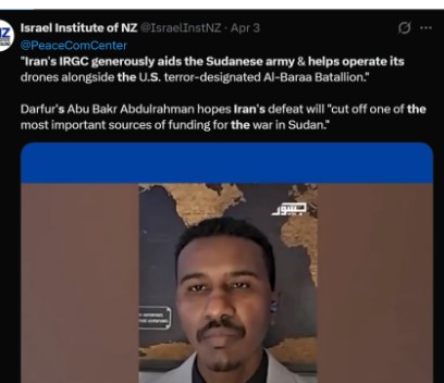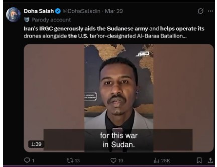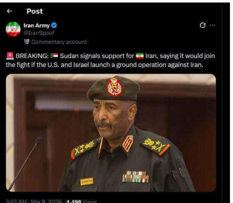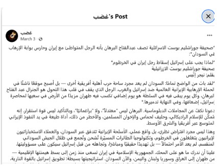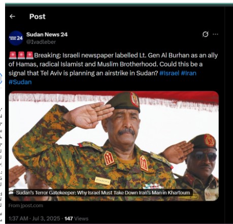 وفي السياق نفسه، شاركت حسابات على منصتي «إكس» و«فيسبوك»، مثل حساب Sudan News 24، مقالًا قديمًا نشرته صحيفة The Jerusalem Post الإسرائيلية التي تصدر باللغة الإنجليزية، في يوليو 2025. وتقول فيه إنه بات جليًا أن «السودان لم يعد مجرد بؤرة حرب أهلية إفريقية أخرى، بل أضحى معقلًا لحملة إيران الإرهابية العالمية ضد إسرائيل والغرب». وتشير إلى قائد الجيش السوداني عبد الفتاح البرهان بوصفه «الشخصية المحورية في هذا التحول»، محذرةً من أن بقاءه في السلطة يعزز مساعي طهران إلى تطويق الدولة اليهودية وإضعافها، وصولًا إلى تدميرها.