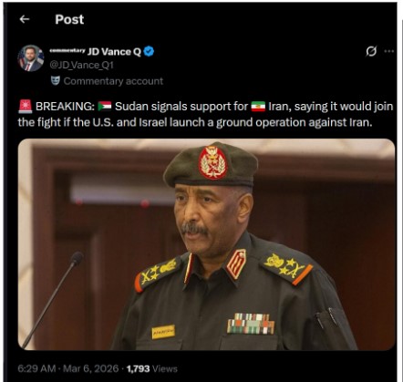 وفي ذروة الصراع الإقليمي، رصد فريق المرصد منشورًا تداولته العديد من الحسابات على منصة «إكس» يفيد بأنّ السودان سينحاز إلى إيران في حال شنت عليها الولايات المتحدة هجومًا بريًا. وجرى إعادة نشر هذا المحتوى وتداوله على نطاق واسع من قبل حسابات عديدة، مما أسهم في تضخيمه في الفضاء الرقمي، في محاولة لتكريس سردية مفادها وجود اصطفاف سياسي وعسكري سوداني إلى جانب إيران.