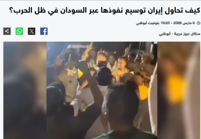 واستمرت «سكاي نيوز» في تغطيتها التي حرصت فيها على ربط السودان بحرب إيران بصورة واضحة، إذ بثت في السادس من مارس الماضي تقريرًا لفتت فيه إلى تزايد التحذيرات من احتمال تحول السودان إلى ساحة صراع غير مباشر بين إيران من جهة والولايات المتحدة وإسرائيل من جهة أخرى، في ظل التوترات المتصاعدة في الشرق الأوسط، مشيرةً إلى ما وصفته بـ«تنامي النفوذ الإيراني في السودان» في ظل الحرب الداخلية. وعرضت القناة مقاطع فيديو لعناصر محسوبة على التيار الإسلامي يعلنون فيها استعدادهم للقتال إلى جانب إيران، لتعضيد هذه السردية.