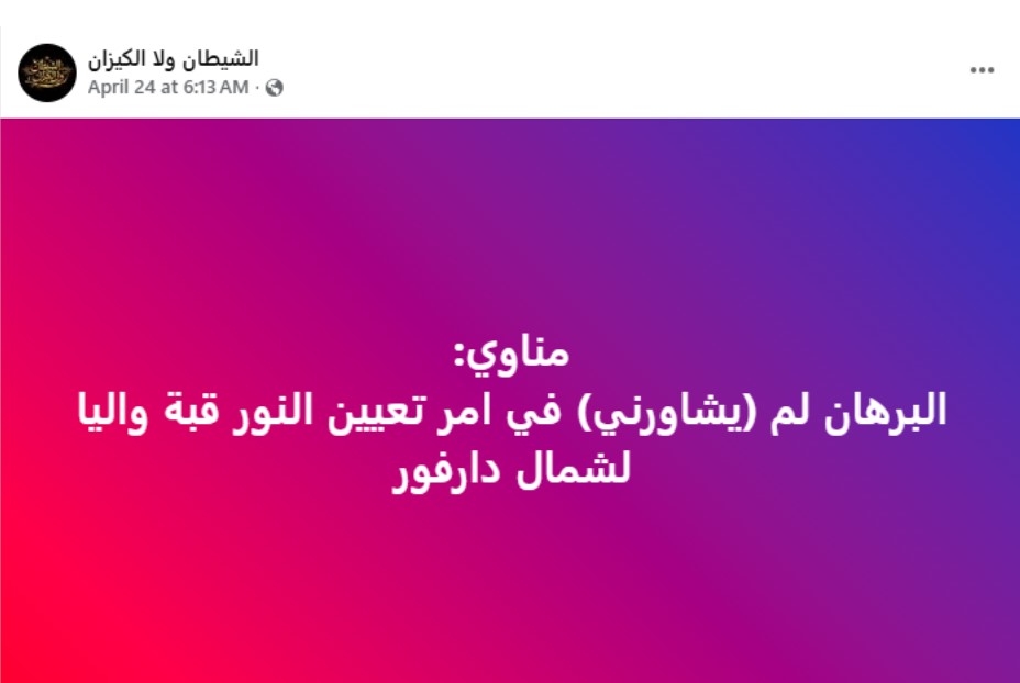 تداولت العديد من الحسابات على منصة «فيسبوك» نص تصريح منسوبٍ إلى حاكم إقليم دارفور مني أركو مناوي، يقول فيه إن البرهان لم يشاوره في تعيين النور القبة واليًا لشمال دارفور.